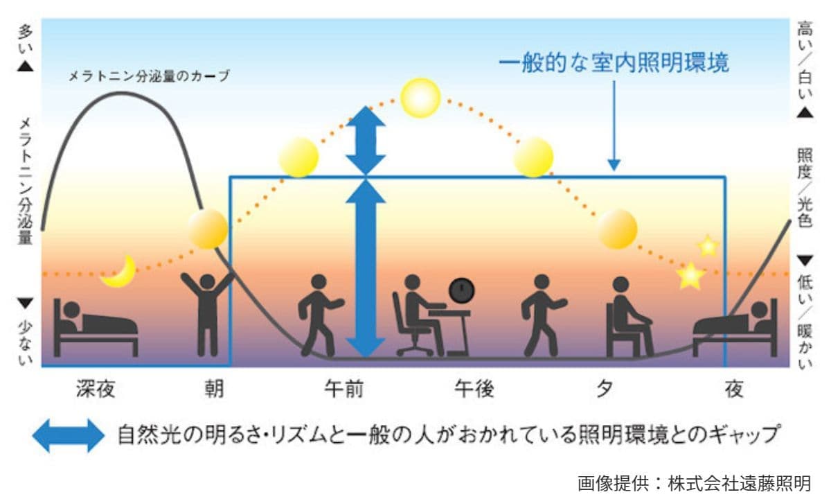 要因として夜遅くに明るい照明を浴びるなどが挙げられますが、実は日中の照度不足も原因の一つとなっています。