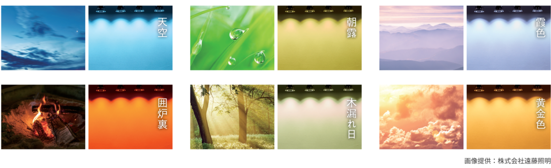 ベース照明で太陽の光5200K、間接光で空の色を演出するなど、光の組み合わせによって、時間の流れや空間の奥行などダイナミックな自然の光環境を再現することが出来ます。