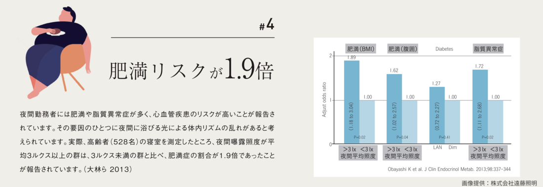 夜間光暴露の増加⇒うつ症状、肥満症、睡眠障害、糖尿病、脂質異常症、高血圧、動脈硬化と関連