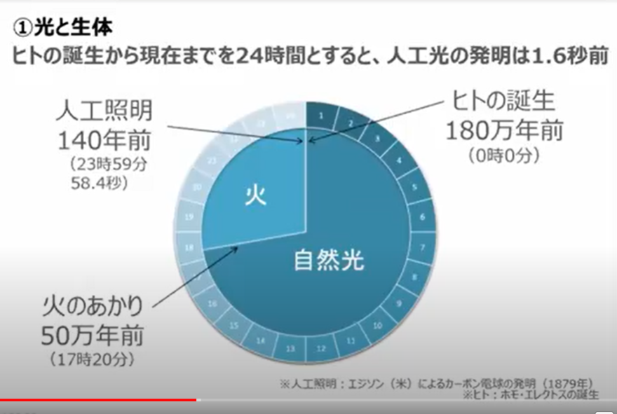 人の誕生から現在までを24時間とすると、人工光の発明はわずか1.6秒前